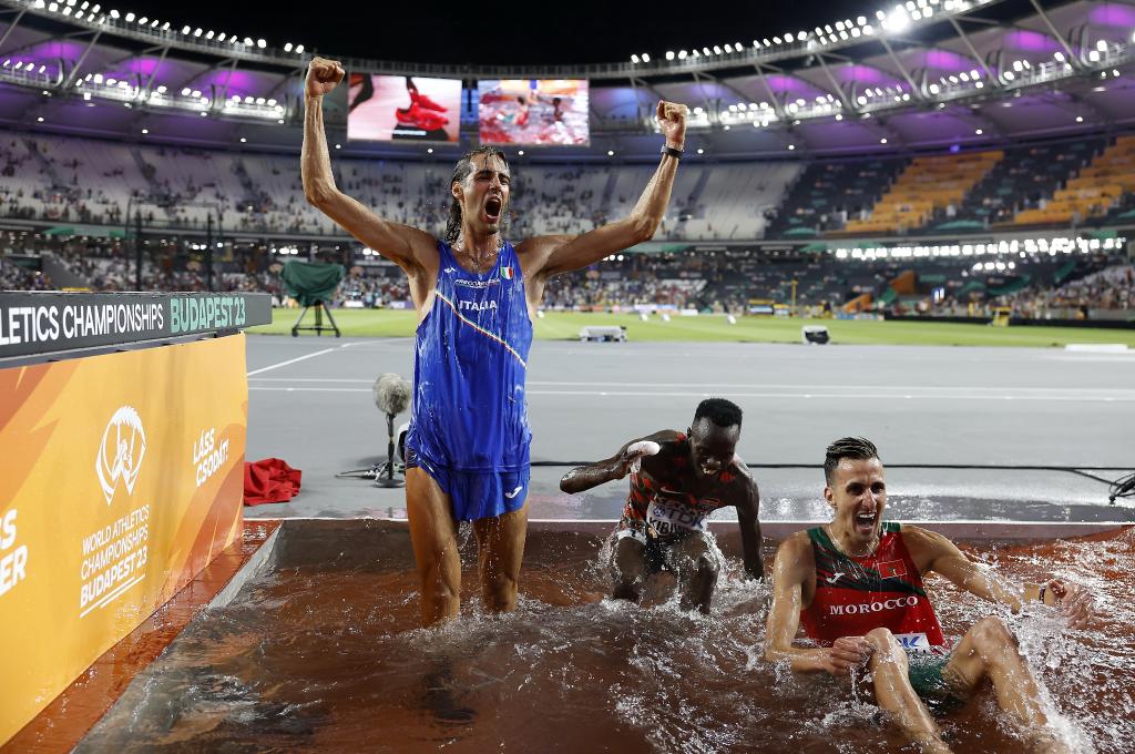 8月22日,男子跳高冠军意大利选手坦贝里(左)、男子3000米障碍赛冠军摩洛哥选手艾尔巴卡里(右)与季军肯尼亚选手基比沃特跳入3000米障碍赛的水坑里庆祝。新华社记者王丽莉摄