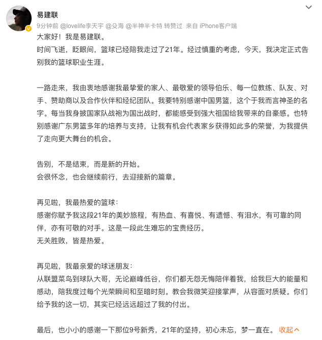 “我要特别感谢中国男篮,这个于我而言神圣的名字。每当我身披国家队战袍为国出战时,都能感受到强大祖国给我带来的自豪感。”易建联在退役信中写道。