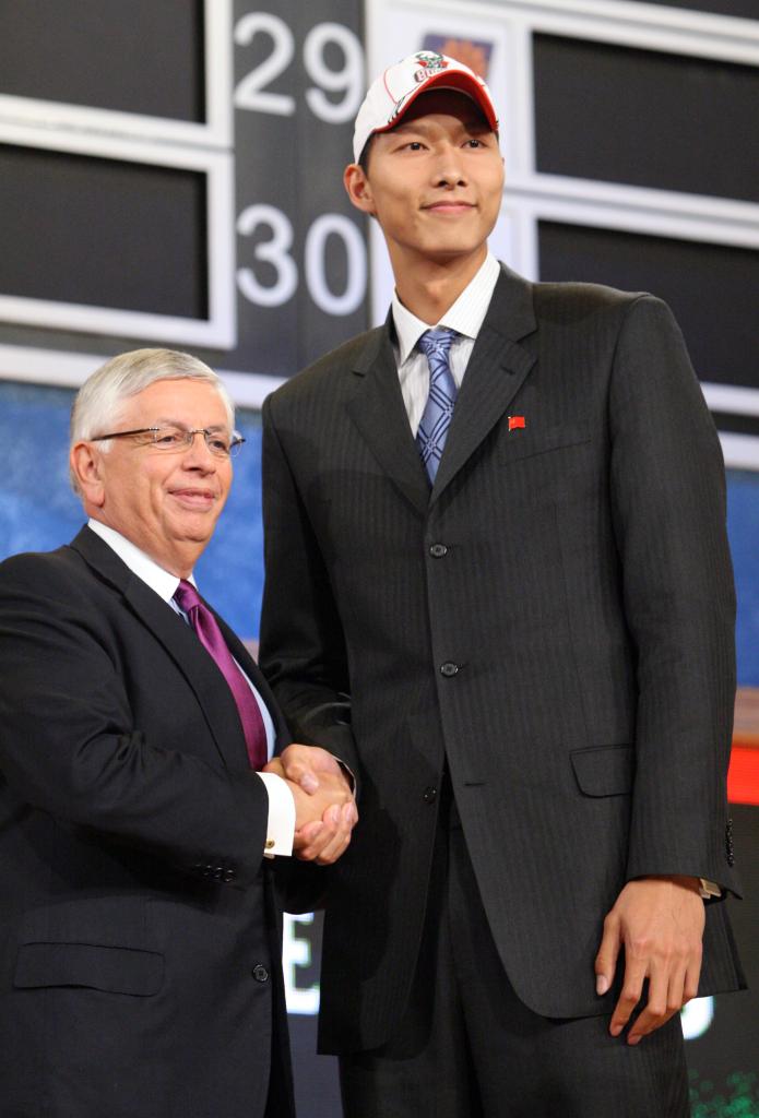 2007年6月28日,中国球员易建联(右)被密尔沃基雄鹿队选中后与时任美职篮总裁大卫·斯特恩合影。新华社记者 侯俊 摄