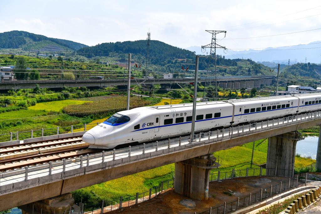 8月31日,一列动车组列车经过位于贵州省都匀市境内的贵南高铁营盘清水河双线特大桥。