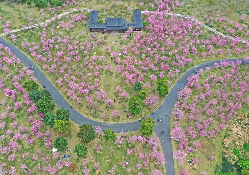 游客在青秀山风景区观赏樱花(2022年3月11日摄)。