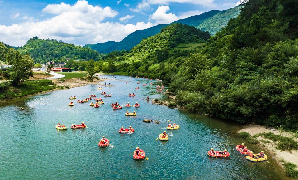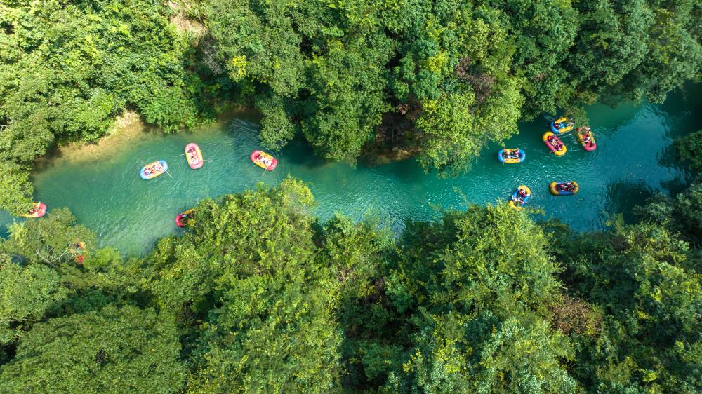 游客在荔波小七孔风景区体验漂流项目(2023年8月15日摄)。