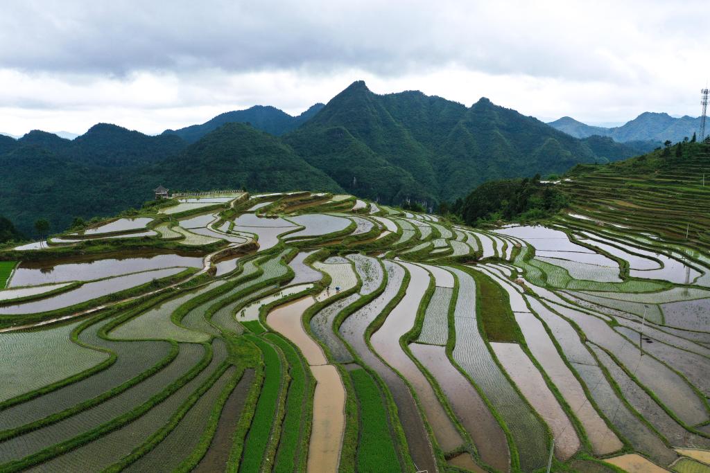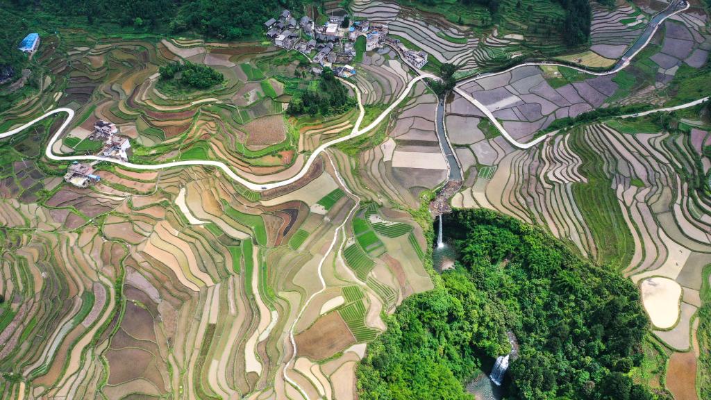 贵定县沿山镇石板村腊利梯田与瀑布(2022年6月1日摄)。