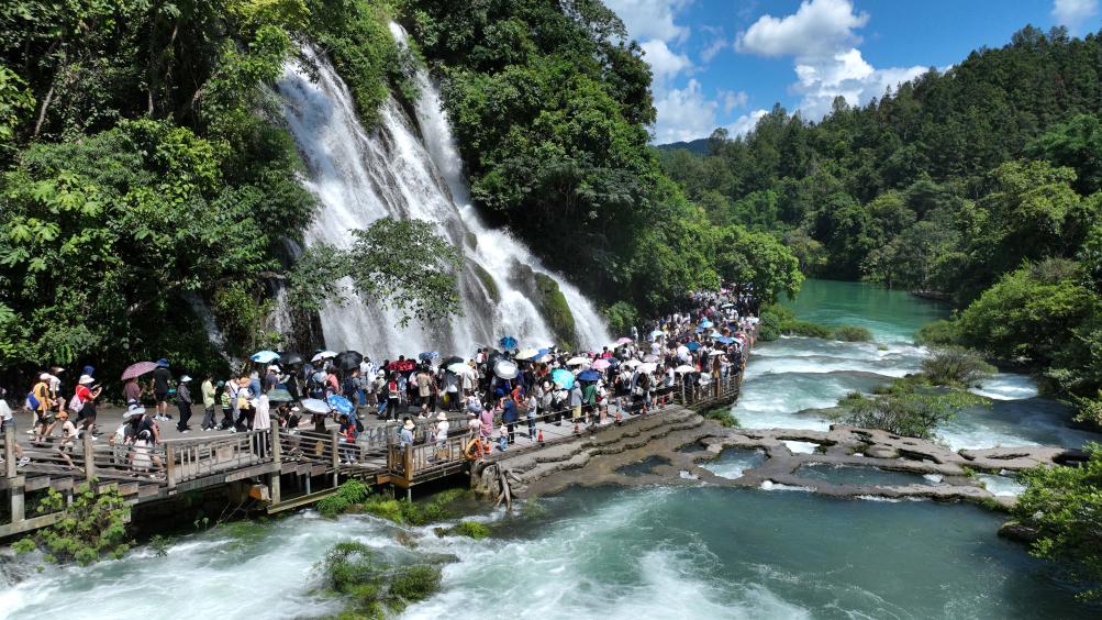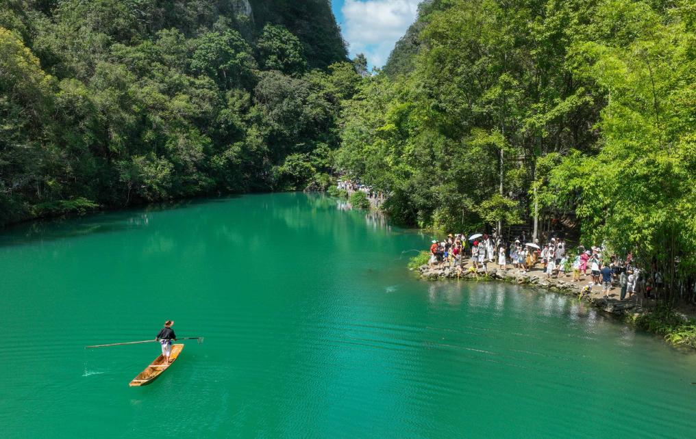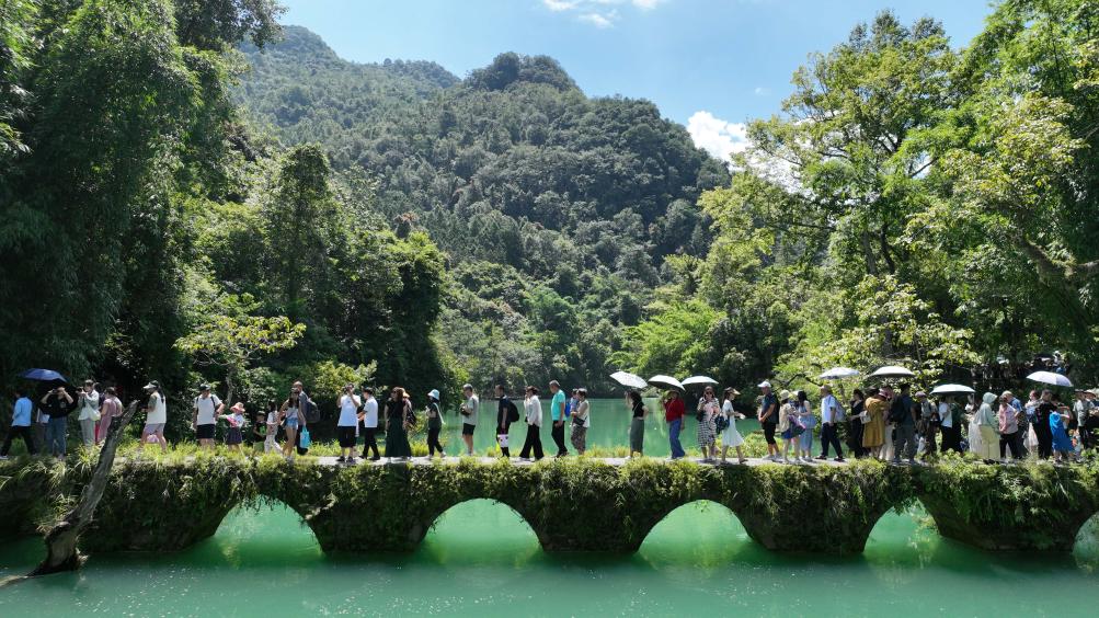 游客在荔波小七孔风景区游玩(2023年8月15日摄)。