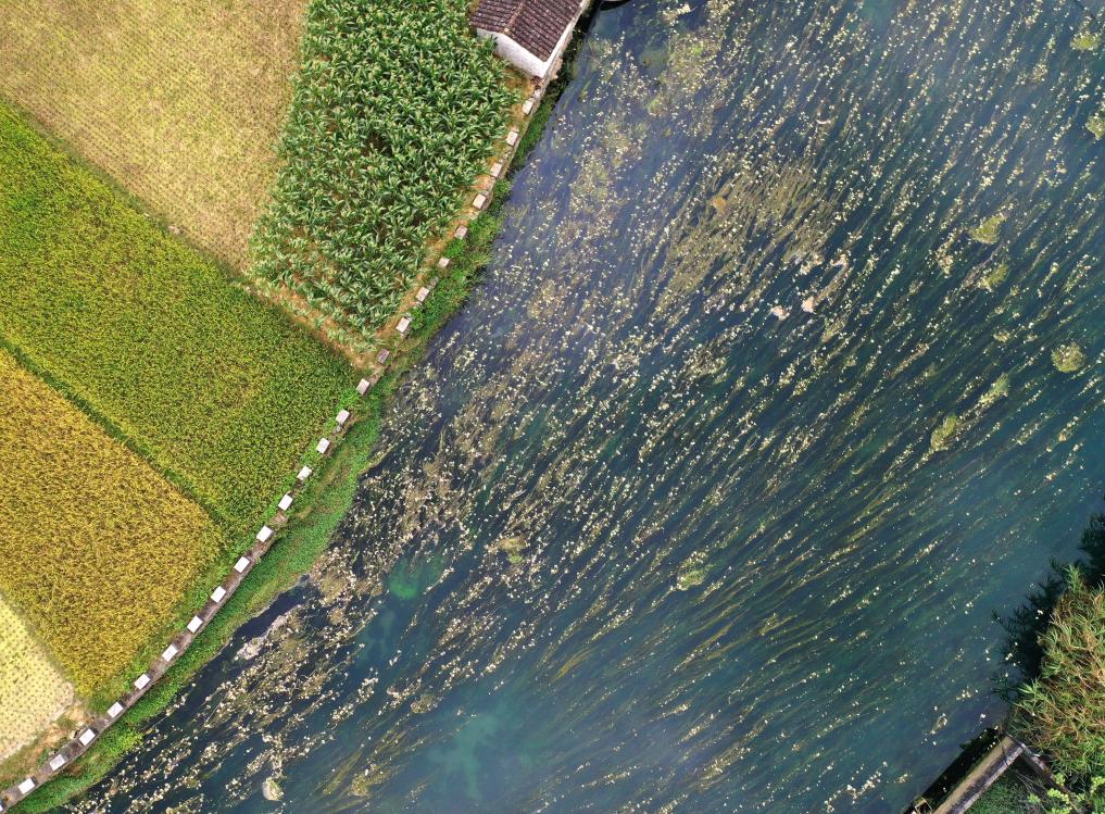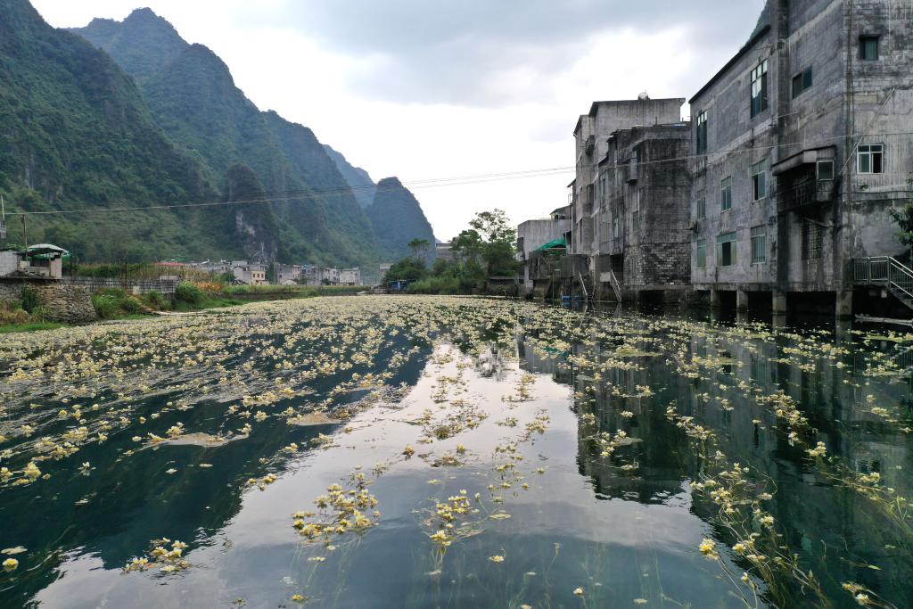 都安瑶族自治县大兴镇境内澄江河段盛开的海菜花。海菜花对生存环境的水质要求高,被视为“水质风向标”。(2020年10月28日摄)
