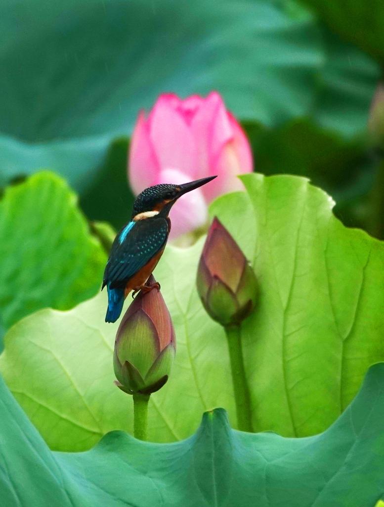 小鸟在青秀山景区荷塘的荷苞上停留(2023年6月9日摄)。