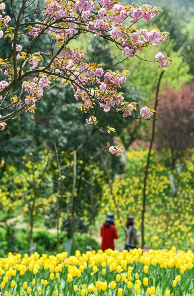 游客在龙架山国家森林公园赏花观光(2021年3月23日摄)。