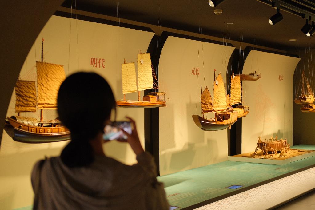 图为观众在拍摄不同朝代的漕船模型。秦宇杭 摄