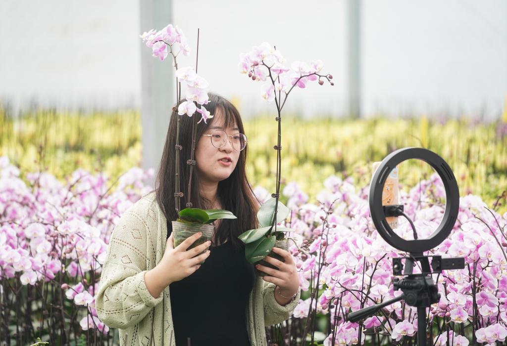 2023年9月9日,江苏省宿迁市王官集镇蝴蝶兰大世界大棚内正在进行网络直播销售。新华社记者季春鹏 摄