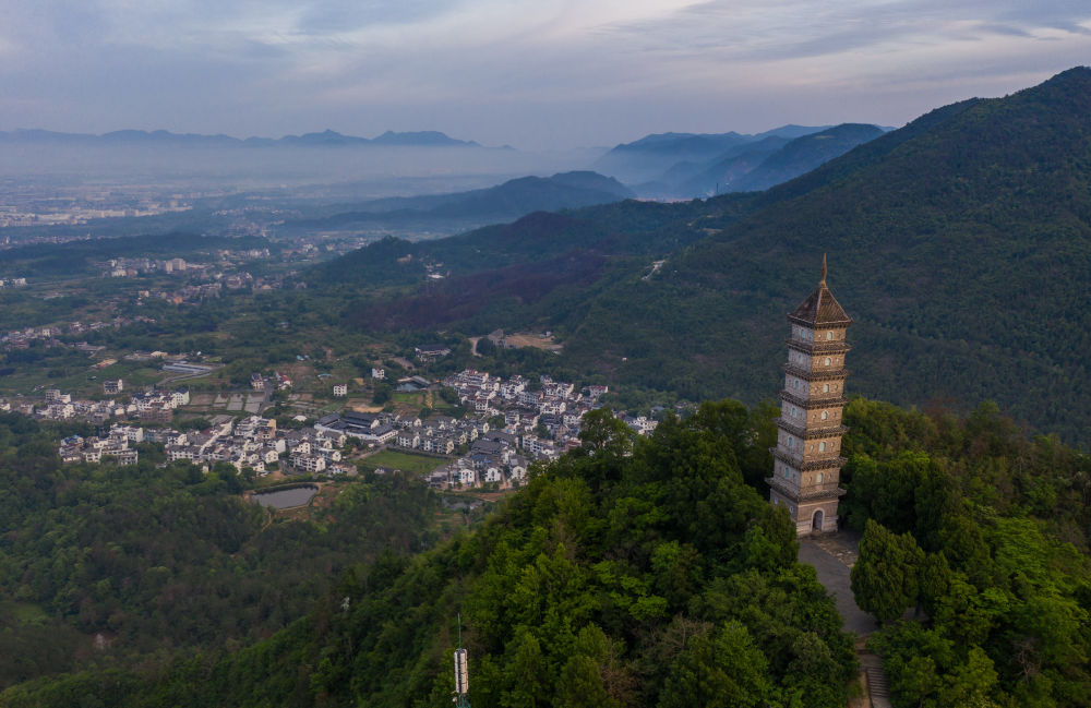 俯瞰天台县的赤城山及山顶的梁妃塔。