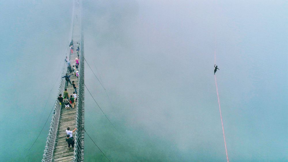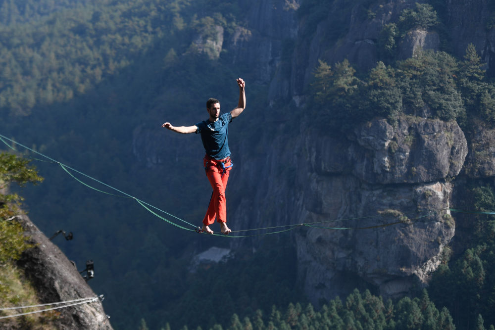 选手在神仙居景区参加高空扁带挑战赛。