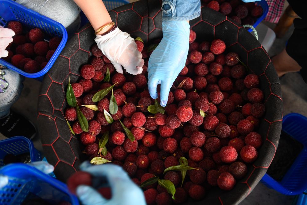 仙居县一家杨梅专业合作社的果农在分拣新鲜的杨梅。