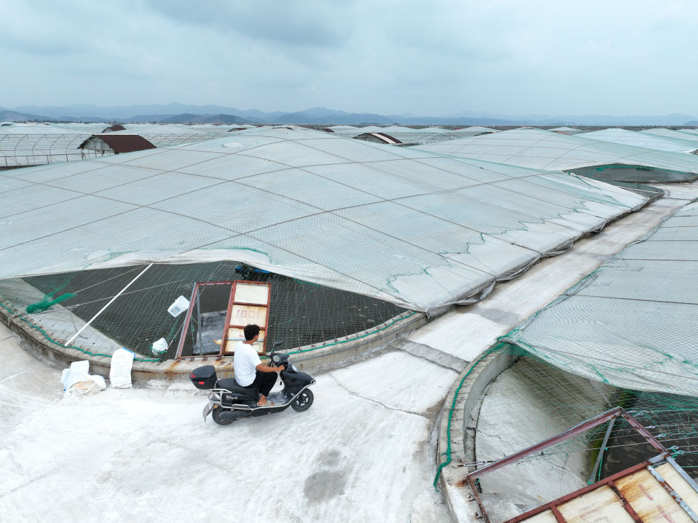 在三门湾蛇蟠岛上的一家水产养殖企业,工作人员在养殖对虾的小棚间巡察。