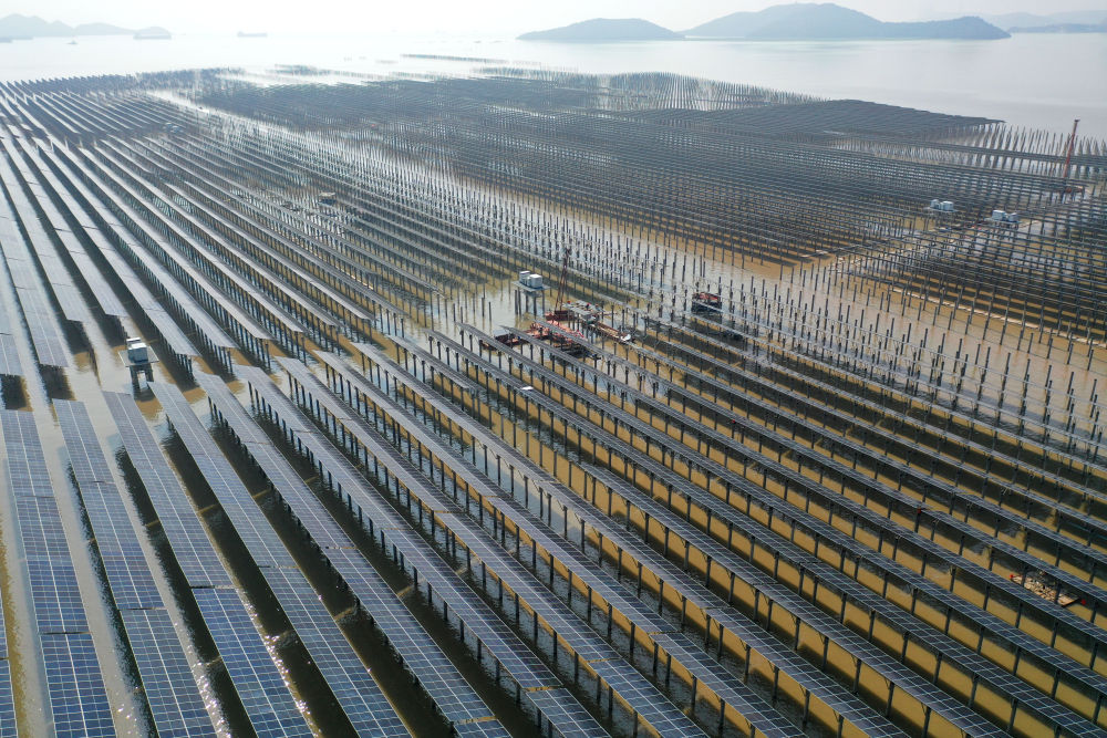 在台州市三门县,施工人员在水上安装中核汇能三门200兆瓦滩涂光伏项目的光伏面板。