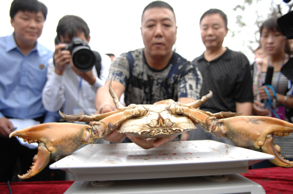 在三门中国青蟹节的“青蟹王擂台赛”上,工作人员在称量一只青蟹。
