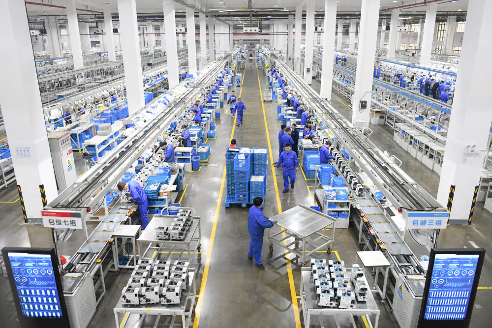 在台州市的杰克科技股份有限公司, 工作人员在装配车间装配缝纫机。