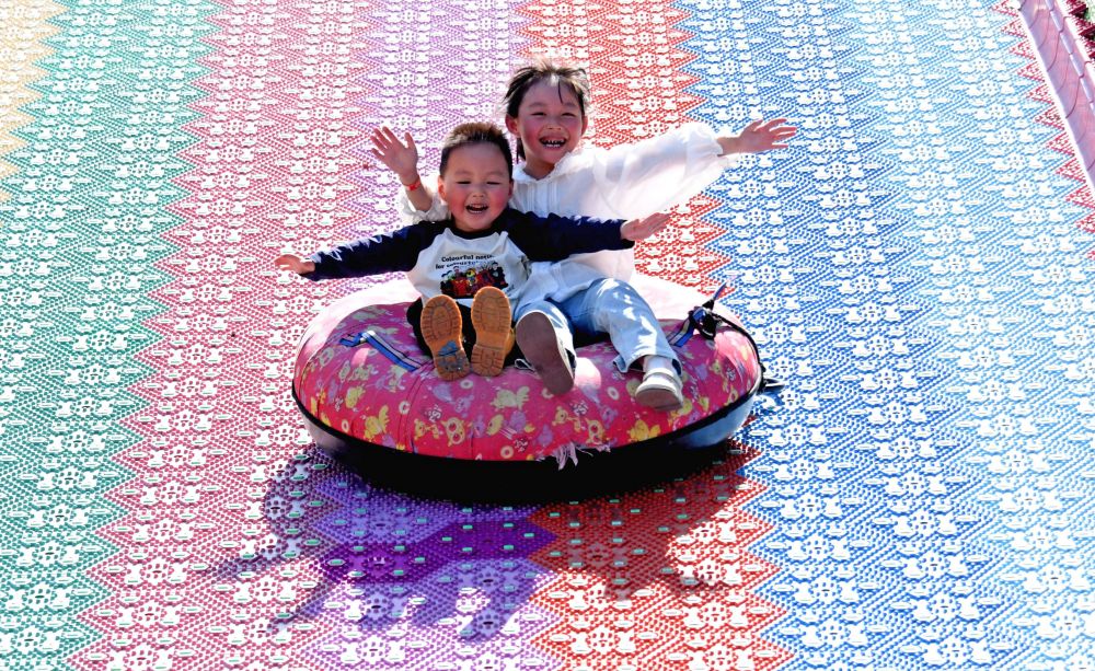 小朋友在台州市仙居县一游乐园体验七彩滑道。
