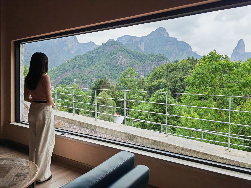 游客在台州市仙居县一处民宿内欣赏窗外风景。
