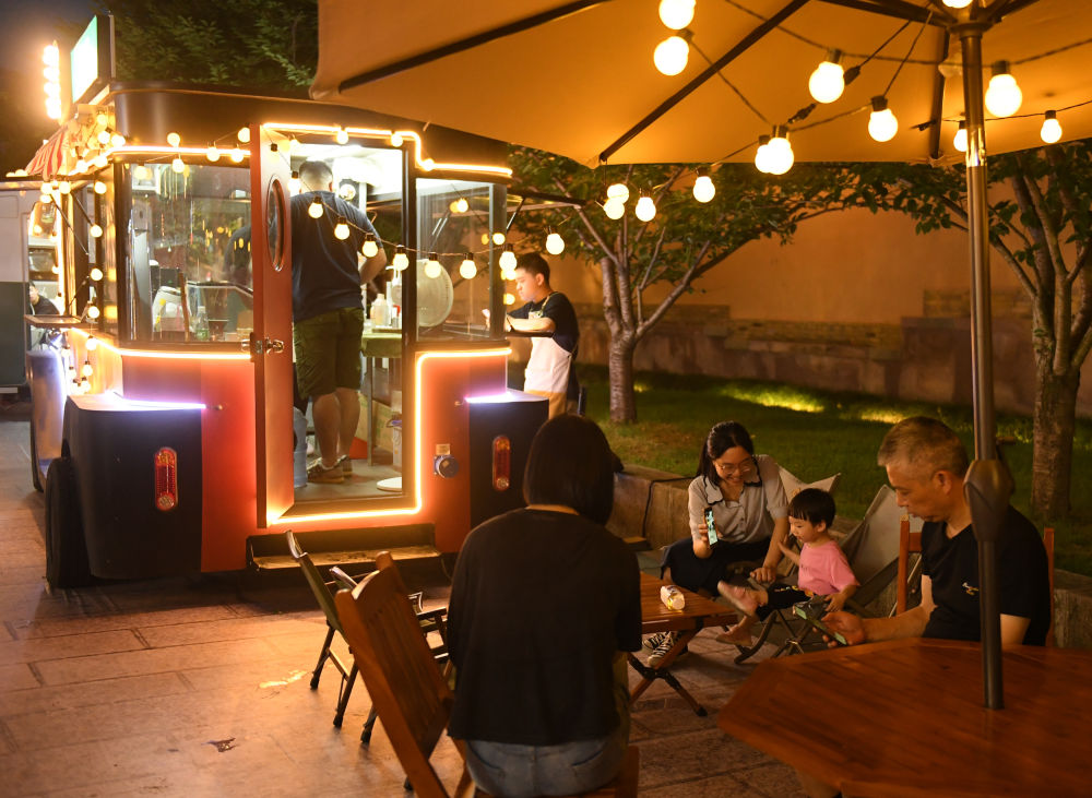 人们在台州府城一辆贩卖饮品的“巴士店铺”边休憩。