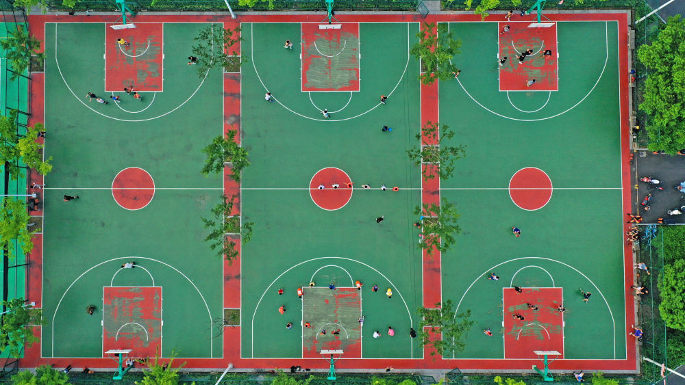 人们在浙江省台州市仙居县庆丰公园运动场打篮球。