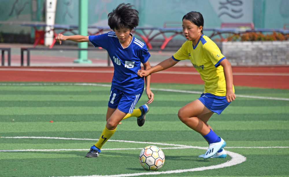 在浙江省台州市仙居县田市镇中心小学,学生们在运动场进行足球训练。