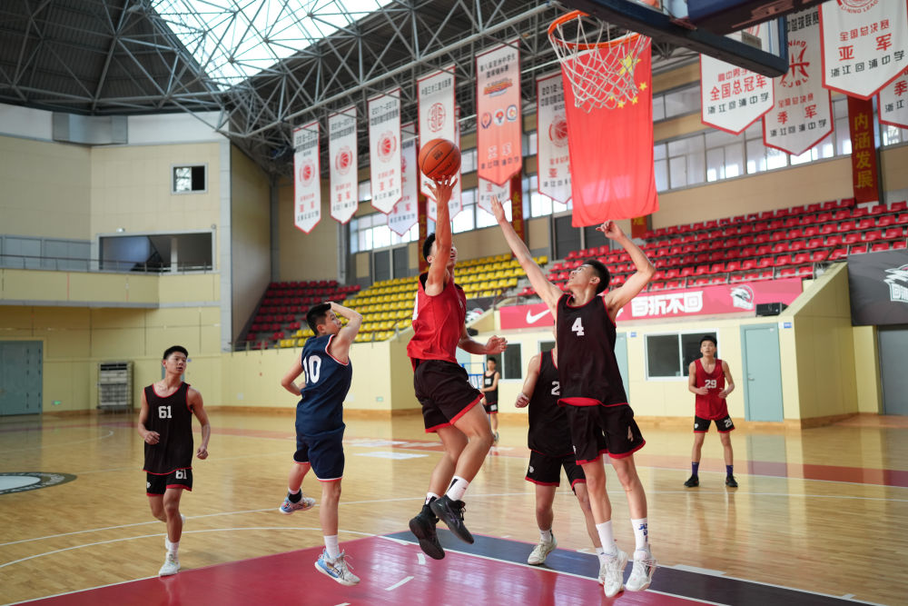 学生在台州临海市回浦中学篮球馆训练。