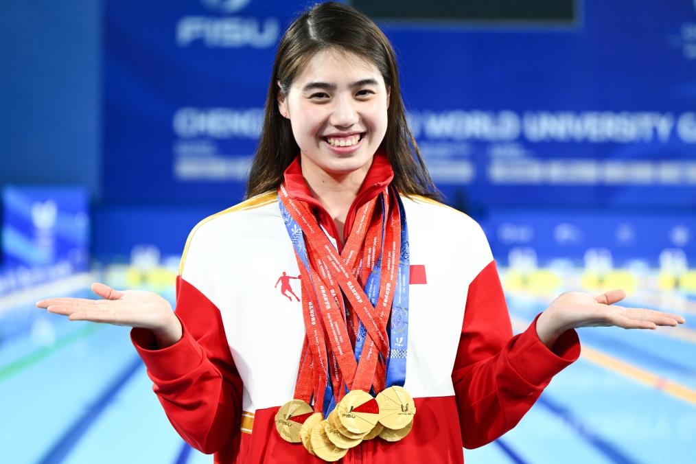 8月7日,参加成都大运会的张雨霏展示她获得的九枚金牌。新华社记者 吴刚 摄