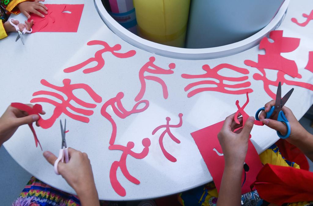 9月13日,孩子们在老师的带领下创作亚运会运动项目的主题剪纸作品。新华社记者 徐昱 摄