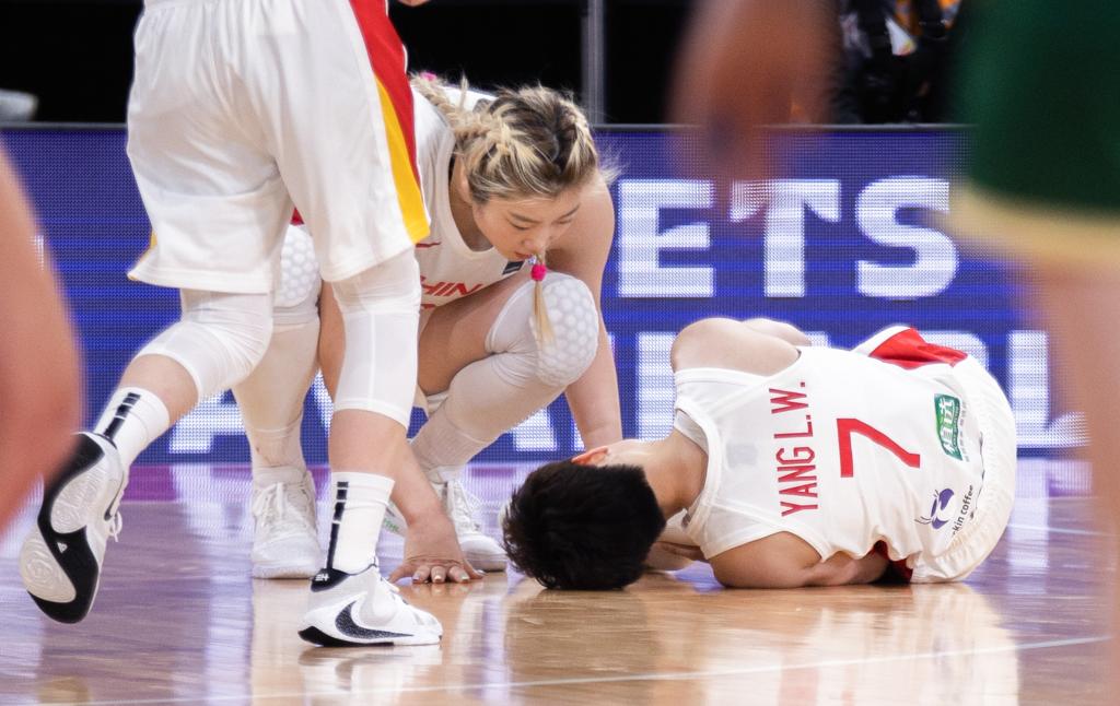 7月1日,杨力维(右)在女篮亚洲杯半决赛中倒地。新华社发(胡泾辰摄)