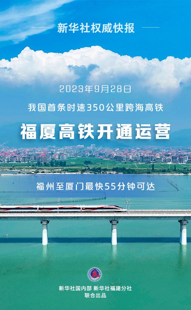 新华社福州9月28日电(记者周义、樊曦)28日上午9时15分,福厦高铁首趟复兴号智能动车组G9801次列车从福州南站缓缓开出,一路南下,奔向厦门北站。这标志着我国首条时速350公里跨海高铁——福厦高铁正式开通运营。