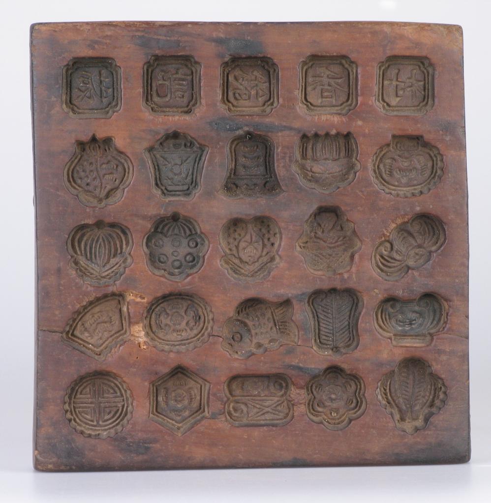 月饼在我国有着悠久的历史。汉代张骞出使西域时,引进芝麻、胡桃,这时便出现了以芝麻、胡桃仁为馅料的圆形饼,名曰“胡饼”。宋代吴自牧在《梦粱录》中有了关于“月饼”的记载。到了明代,中秋吃月饼在民间逐渐流传。清代时,中秋吃月饼更加普及。发展至今,吃月饼已经是我国南北各地过中秋的习俗。月饼模子是月饼这一饮食文化的载体,一般选取结实耐用的硬木,如枣木、梨木等,模子内大多刻有“福、禄、寿”等字样或玉兔、莲花等吉祥图案。