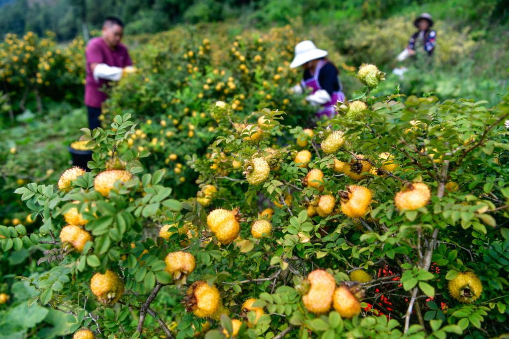 9月1日,村民在贵州省龙里县谷脚镇茶香村采摘刺梨。新华社记者杨文斌摄