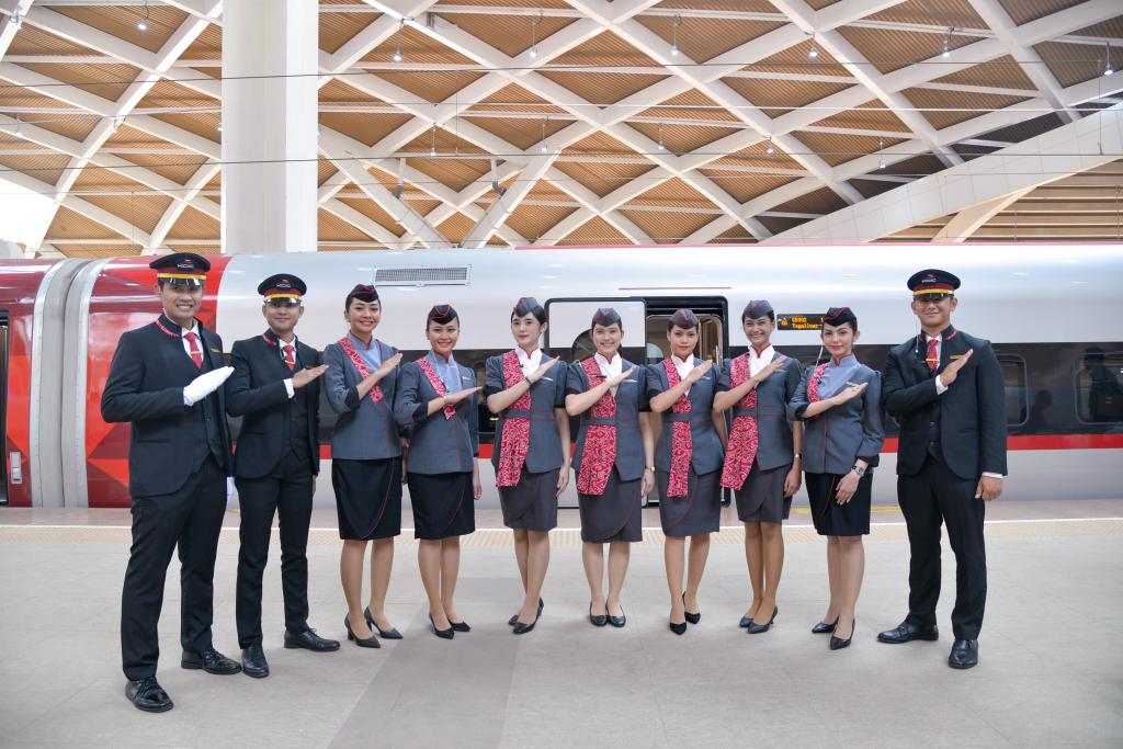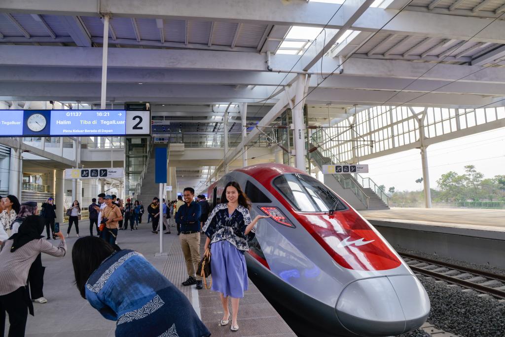 10月2日,在印度尼西亚雅加达哈利姆高铁站,乘务人员在站台上摆出寓意“快速”的手势和雅万高铁动车组合影。
