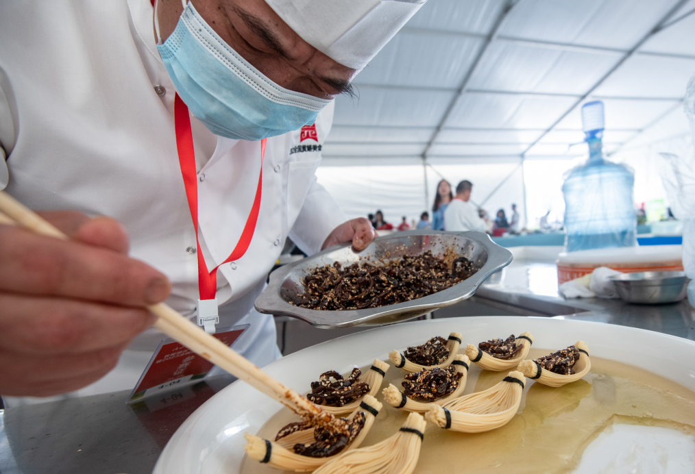 10月28日,在首届湖北(仙桃)黄鳝节暨2023全国黄鳝美食邀请赛上,参赛厨师在摆放菜品“脆鳝乘舟”。(杜子璇 摄)