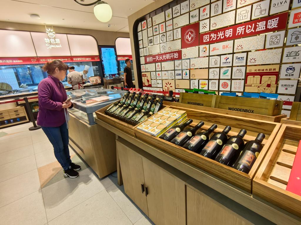 光明城市厨房水城路社区食堂示范门店里,居民正在采购“进博同款”进口食品。新华社记者周蕊 摄