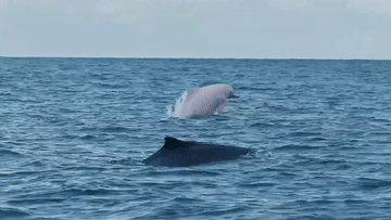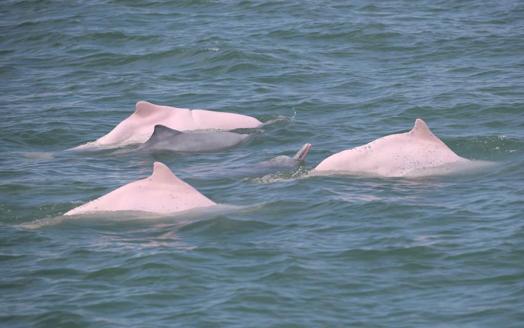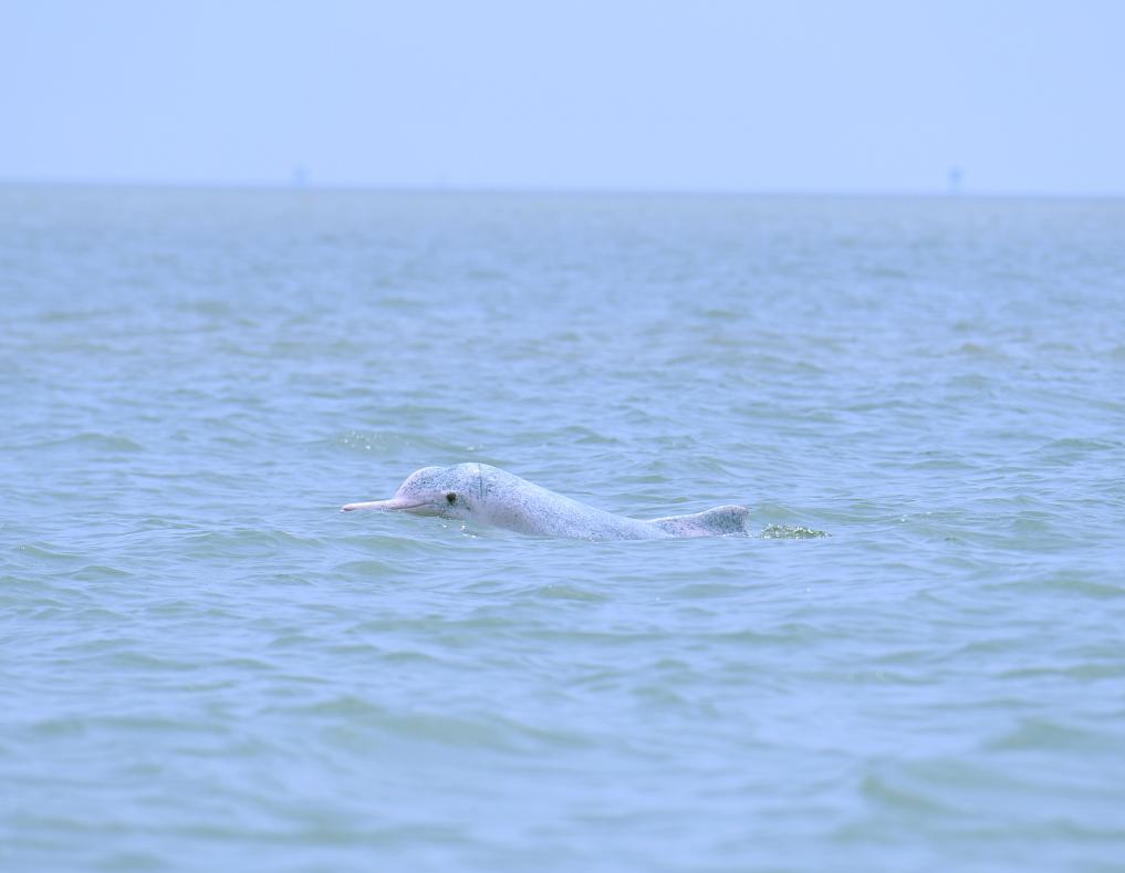 广西钦州市三娘湾海域,一头野生中华白海豚在自由嬉戏。新华社记者 周华 摄