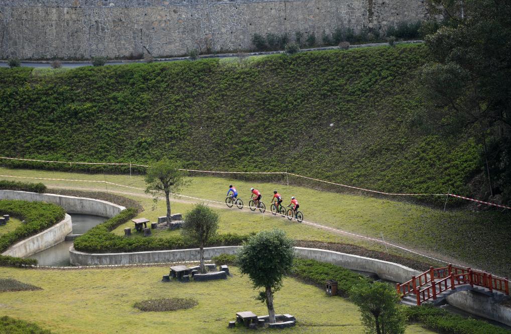 10月28日,参赛选手在第一届全国学生(青年)运动会男子山地自行车越野赛比赛中。新华社记者 陆波岸 摄