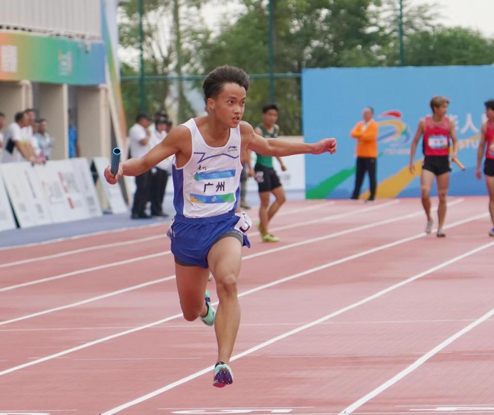 11月6日,吴昊霖冲过终点线。当日,在(公开组)男子4×100米接力决赛中,广州队以39秒42获得冠军。(图片由受访者提供)