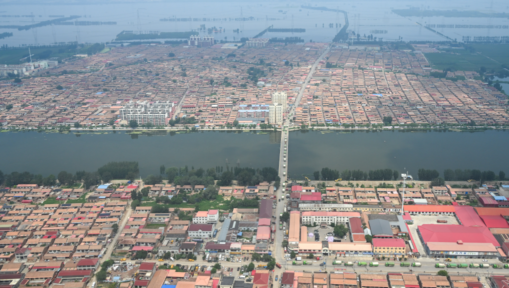 2023年8月8日在直升机上拍摄的天津市静海区台头镇,东西流向的大清河将这个常住人口超过2万的小镇分为南北两个部分。7月底强降雨以来,海河流域内的多条河流出现编号洪水。