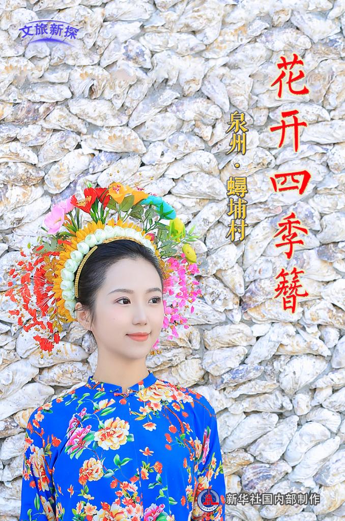 游客在泉州蟳埔村体验“簪花围”拍照。新华社记者 庞梦霞 摄
