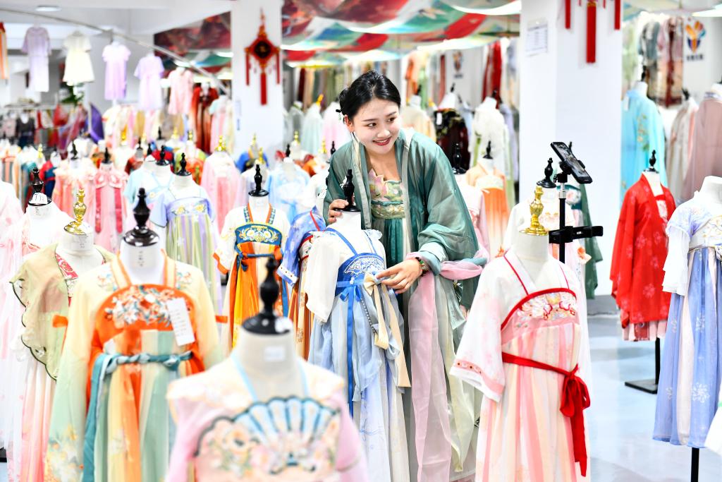 2023年7月6日,在曹县安蔡楼镇有爱云仓汉服基地,女主播在为顾客视频选购汉服。新华社记者 郭绪雷 摄