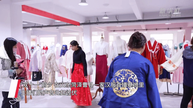 “双十一”前夕,走进位于曹县安蔡楼镇的有爱云仓汉服基地,各式汉服、演出服装、儿童服饰应接不暇,主播们的声音此起彼伏。