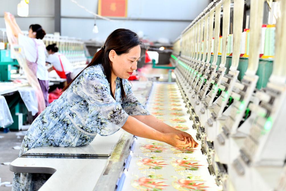 2023年7月6日,在曹县安蔡楼镇李想绣花厂,工作人员在绣花前接线。新华社记者 郭绪雷 摄