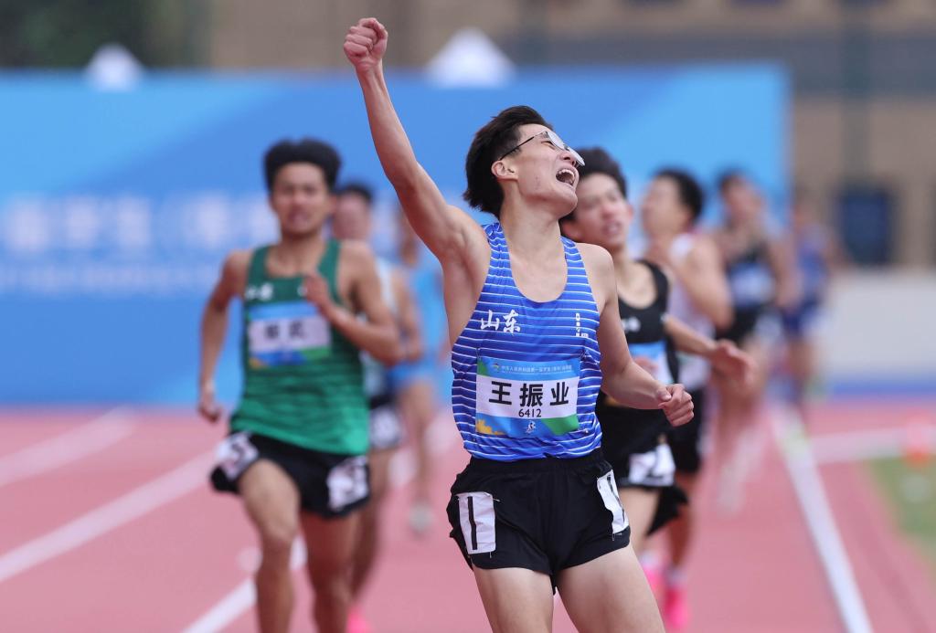 11月13日,王振业在比赛中冲过终点。当日,在第一届全国学生(青年)运动会田径项目中学组男子1500米决赛中,山东选手王振业夺冠。新华社记者 吴梓溢 摄
