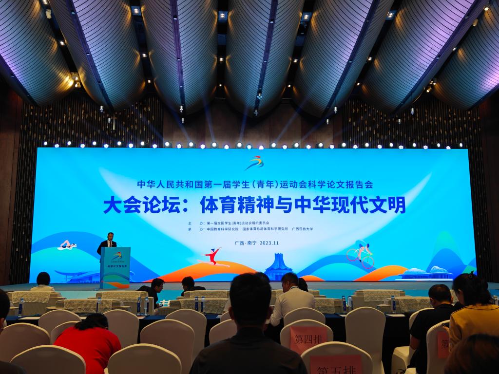 在学青会举办期间,第一届全国学生(青年)运动会科学论文报告会(以下简称“科报会”)在南宁开幕。为期两天的科报会以“服务强国建设 推进新时代青少年和学校体育高质量发展”为主题,与会人员以学术交流、政策对话、文化展示等形式展开研讨。