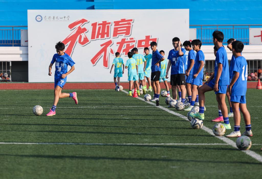 10月18日,长兴县龙山中学体教融合班的学生在完成了文化课学习后,在操场上进行足球训练。新华社记者 徐昱 摄