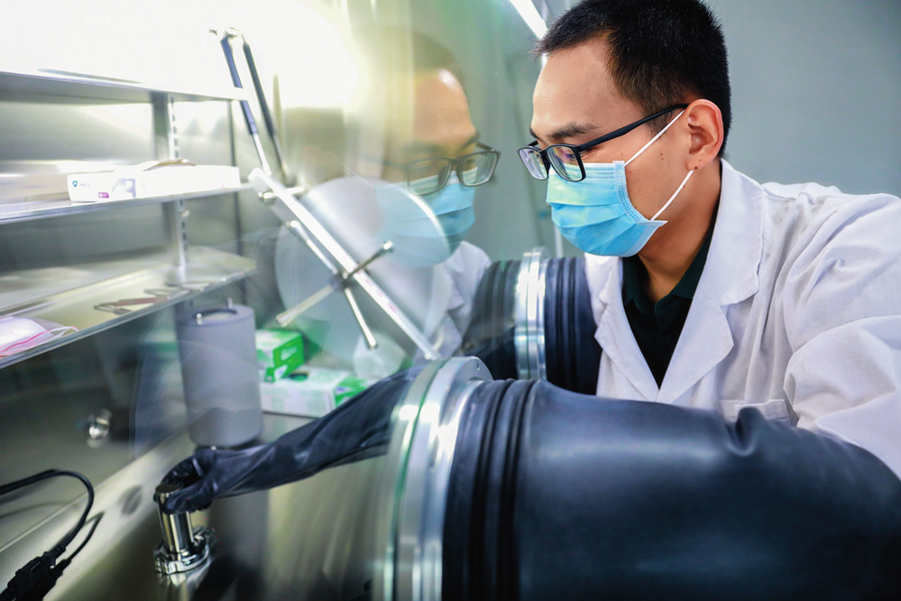 科研人员在位于广东东莞的松山湖材料实验室做实验,进行月壤样品研究(2021 年 9 月摄) 松山湖材料实验室供图