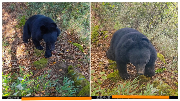 左图:这是古蔺县赤水源黄荆老林自然保护中心布设在黄荆老林中的红外相机拍摄的亚洲黑熊(2022年10月25日摄)右图:这是在黄荆老林拍摄的亚洲黑熊(4月26日摄)。颜宇供图