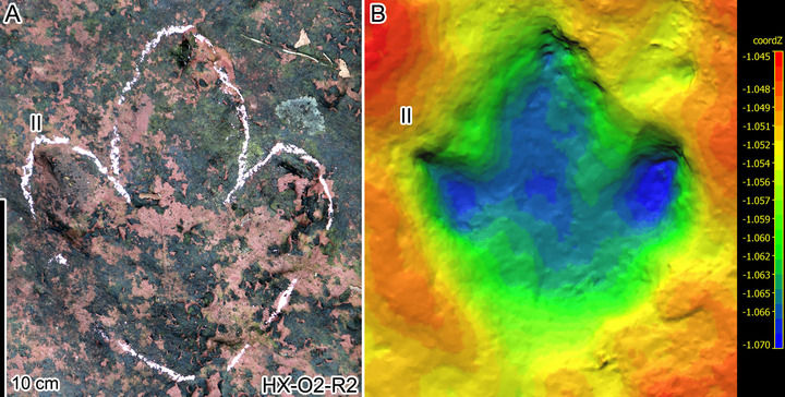 这是在古蔺县黄荆镇汉溪村石凤窝拍摄的兽脚类恐龙足迹和研究影像(2014年7月10日摄)。徐挺供图