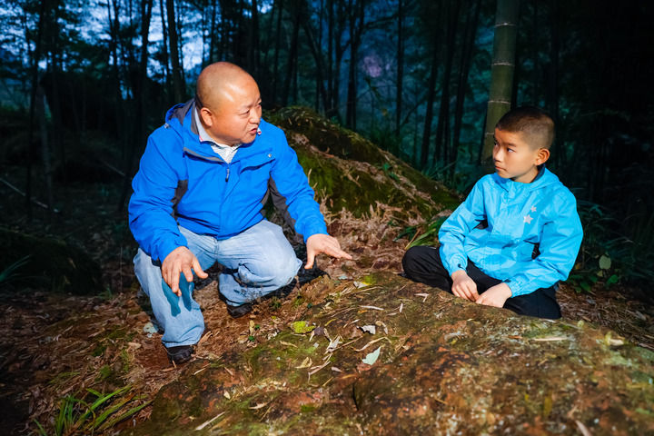 古蔺县文史爱好者徐挺总爱带着儿子来这片森林里探险“寻宝”,他也热心于向人们展示和讲解那些脚印。